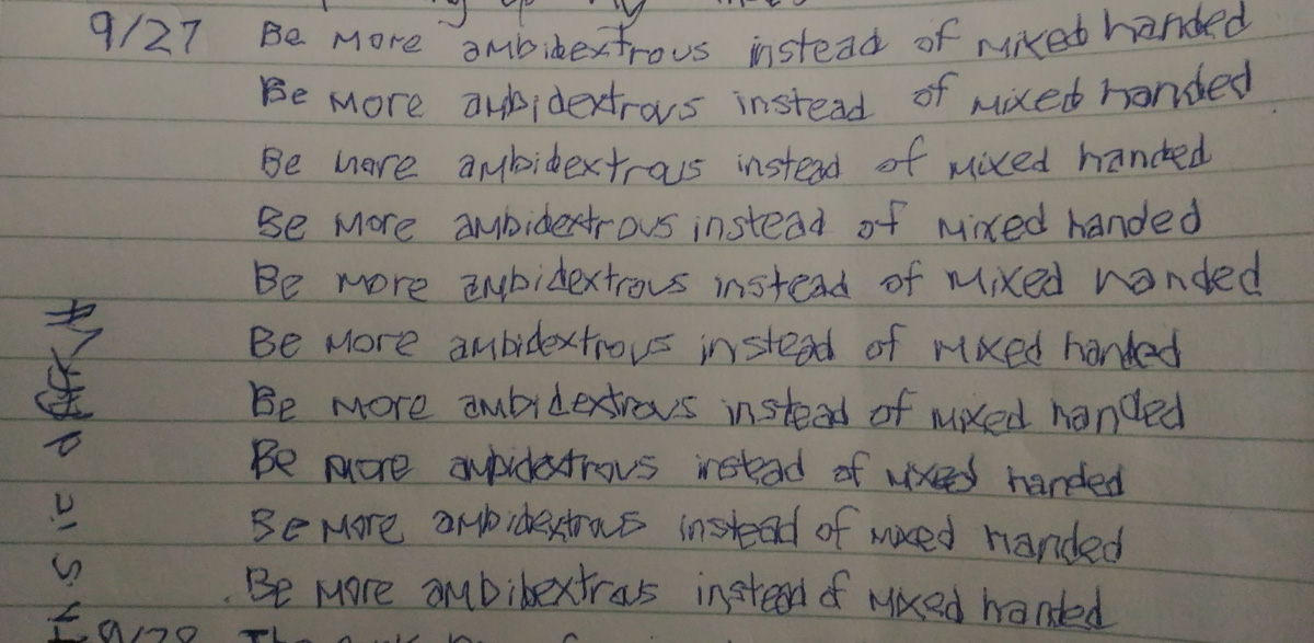 I am a lefty. This is my right hand trying to write things – 10 lines a day.